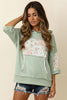 OVERSIZED LOOSE FIT FLORAL PATCHWORK COLOR BLOCK ELBOW LENGTH SLEEVE WAVE RIB PULLOVER WITH HOODIE AND KANGAROO POCKET