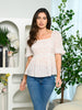 Features:Breathable cotton fabric, flattering peplum design, ideal for layering, perfect for spring and summer, trend-forward pattern, versatile styling options, boutique bestseller.