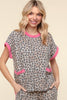 ROUND DOLMAN SHORT SLEEVE LEOPARD PRINT SOLID FRENCH TERRY COLOR BLOCK KNIT TOP WITH POCKET