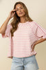 ROUND NECK RAGLAN OVERSIZED LOOSE FIT SHORT SLEEVE TEXTURED STRIPE KNIT TOP WITH OUT SEAM OVERLOCK REVERSE STITCHES