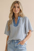 STITCHED NECK BAND FLUTTER SHORT SLEEVE VERTICAL PIN STRIPE WOVEN BLOUSE