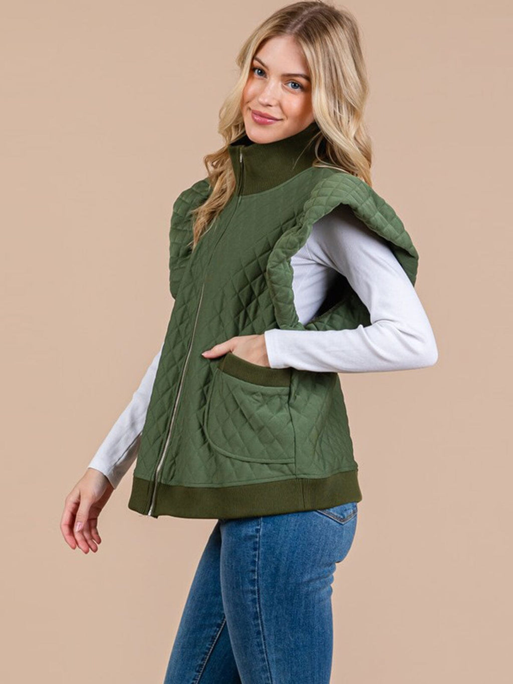 The Women's Ruffle Sleeve Padded Vest is a trend-forward layering piece featuring a chic turtle neck and practical zip-up front. Made from a soft polyester and spandex blend, this vest offers both style and comfort with its playful ruffle sleeves and convenient front pockets. Ideal for cool weather styling, it pairs perfectly over casual tops or sleek turtlenecks, making it a bestseller with boutiques and a must-have for retailers.