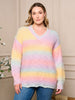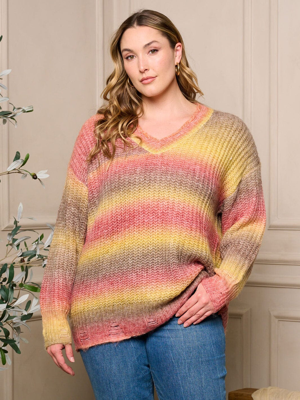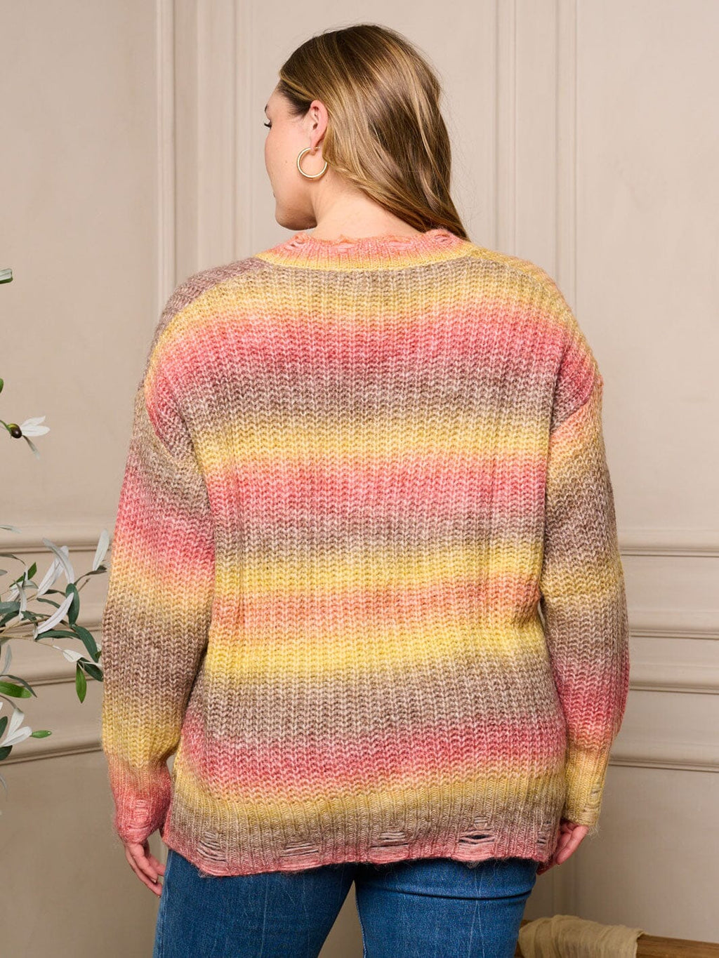 PLUS SIZE LONG SLEEVE V-NECK PULLOVER COLORBLOCK DISTRESS SWEATER