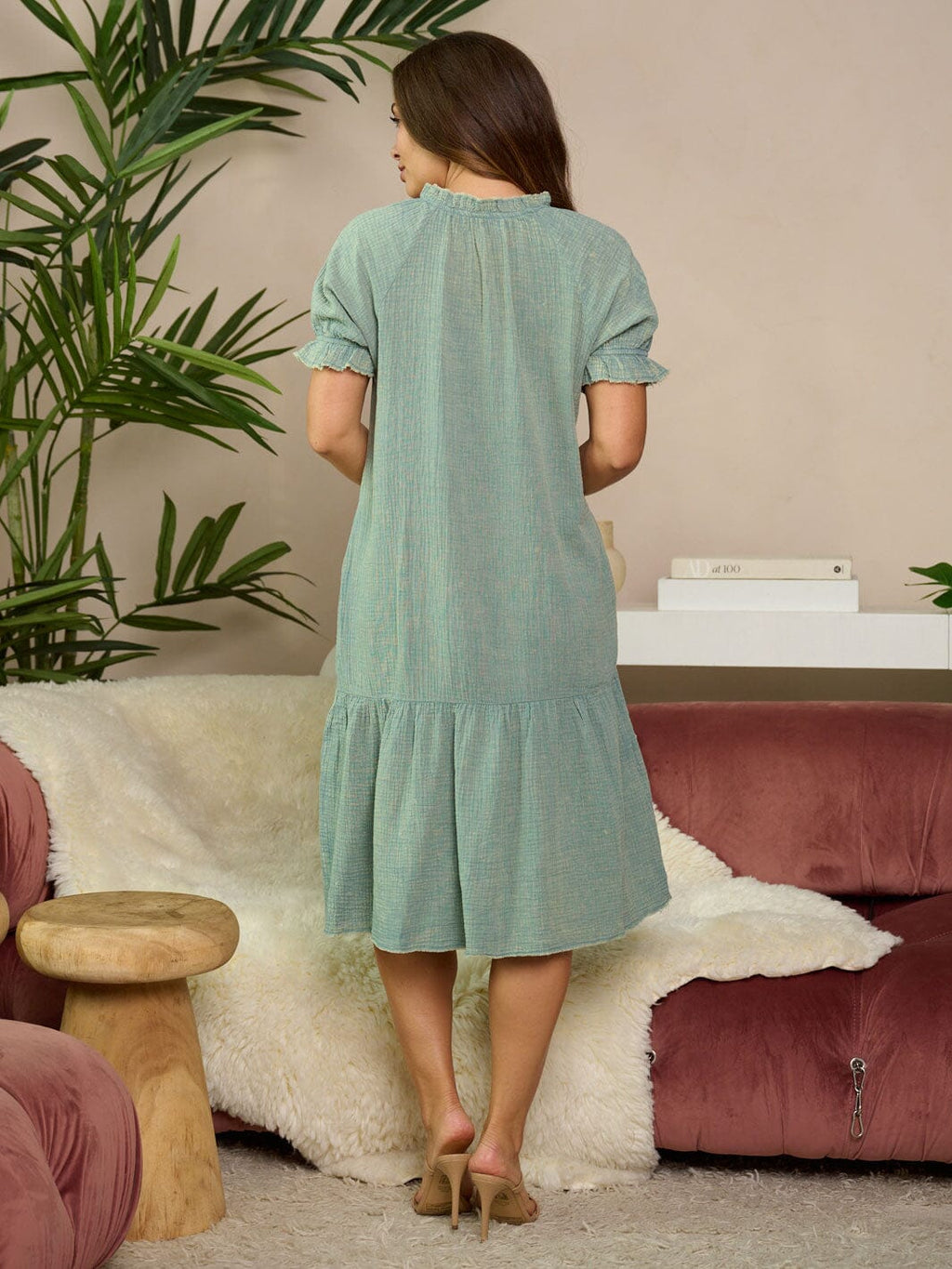 This trendy midi dress is a must-have for retailers looking to stay ahead of the fashion curve. Made with 100% cotton fabric, this dress features a flattering v-neckline, short sleeves, and tiered pockets. Its versatile silhouette and chic design make it the perfect bestseller for boutiques.