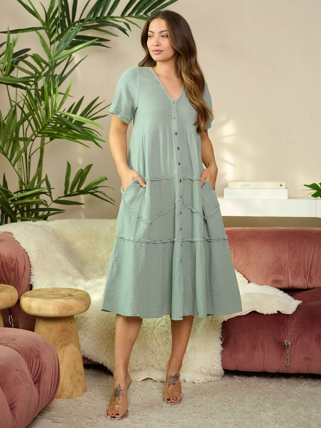 Features:Breathable 100% cotton fabric, tiered design with pockets, flattering midi length, versatile for casual or dressy occasions, perfect for spring and summer collections, easy to layer, popular with trend-focused boutiques.
