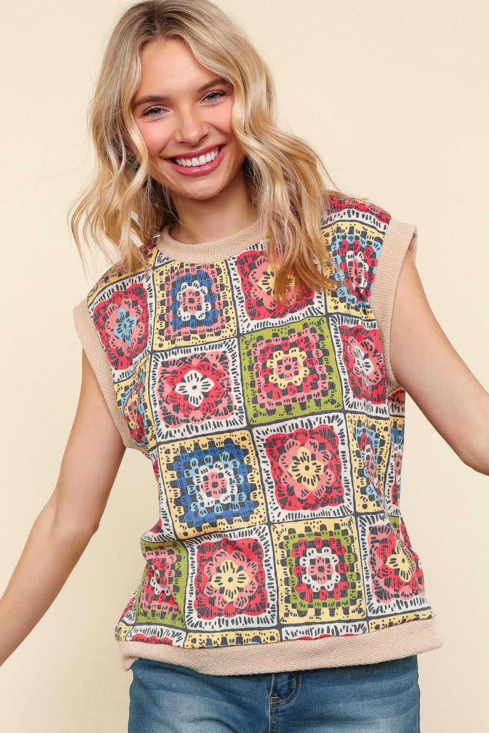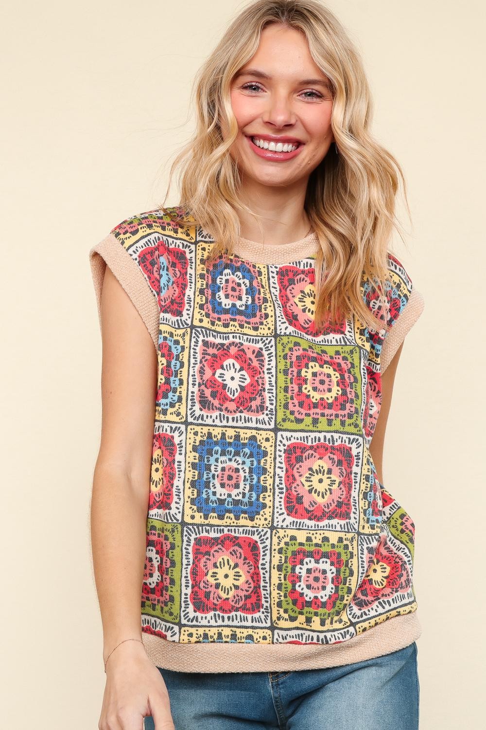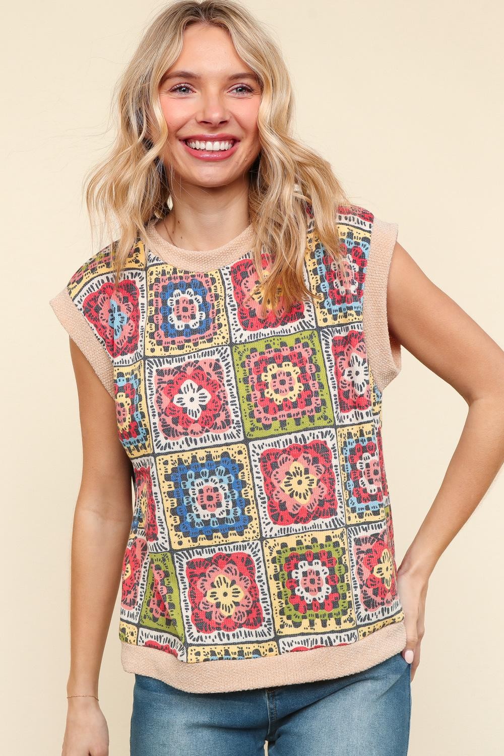 ROUND NECK COLOR BLOCK BAND DOLMAN SHORT SLEEVE FLORAL CROCHET PRINT THERMAL KNIT TOP