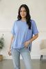 This short sleeve loose fit knit pullover features cap short sleeves and a hi-lo hem design. Super soft with stunning outseam reverse stitching, this will soon be your fall go-to staple! Wear with all your denim.