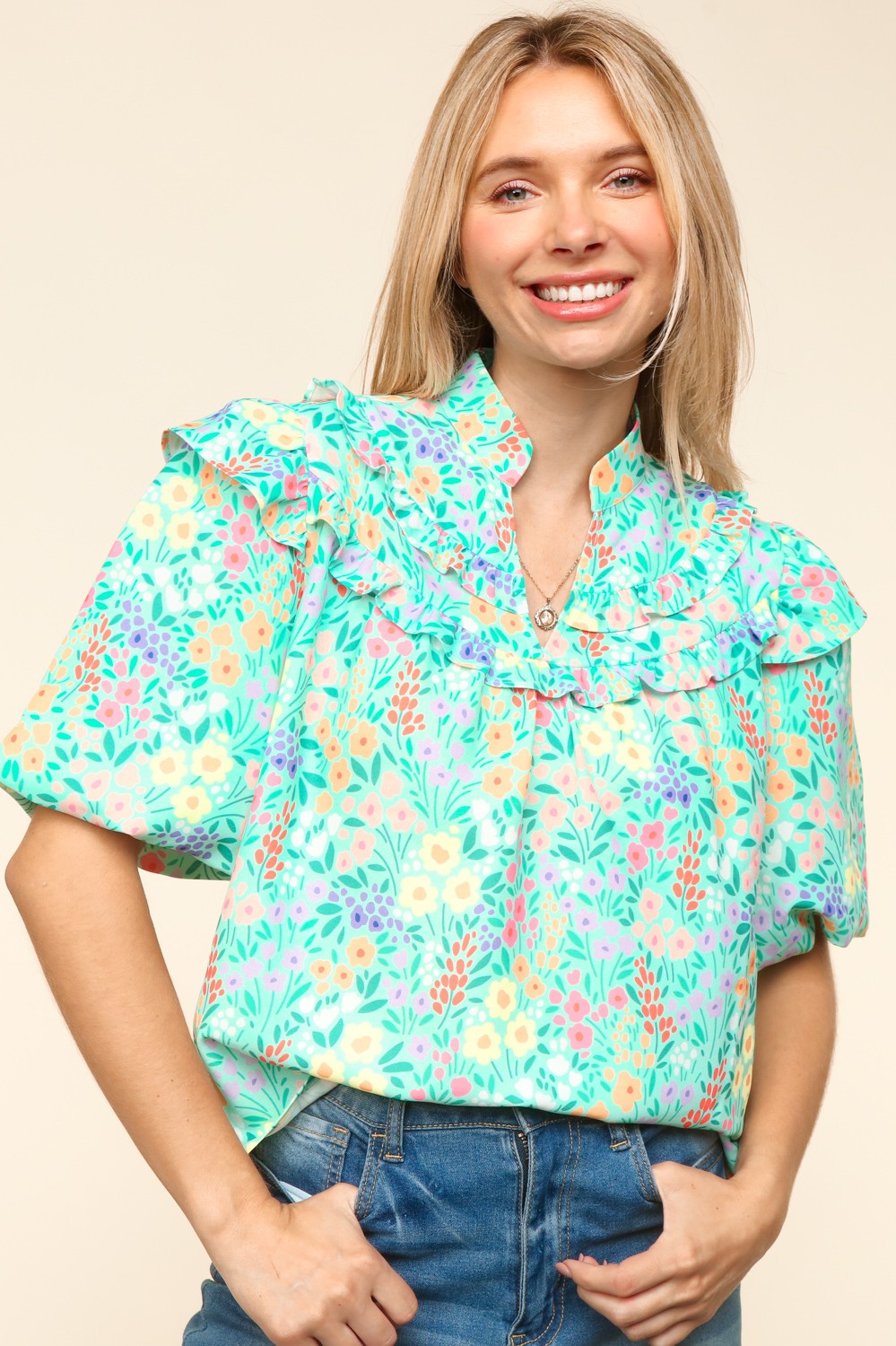 NOTCH NECK FRILLED YOKE RUFFLE AND PUFF SHORT SLEEVE FLORAL PRINT BLOUSE TOP
