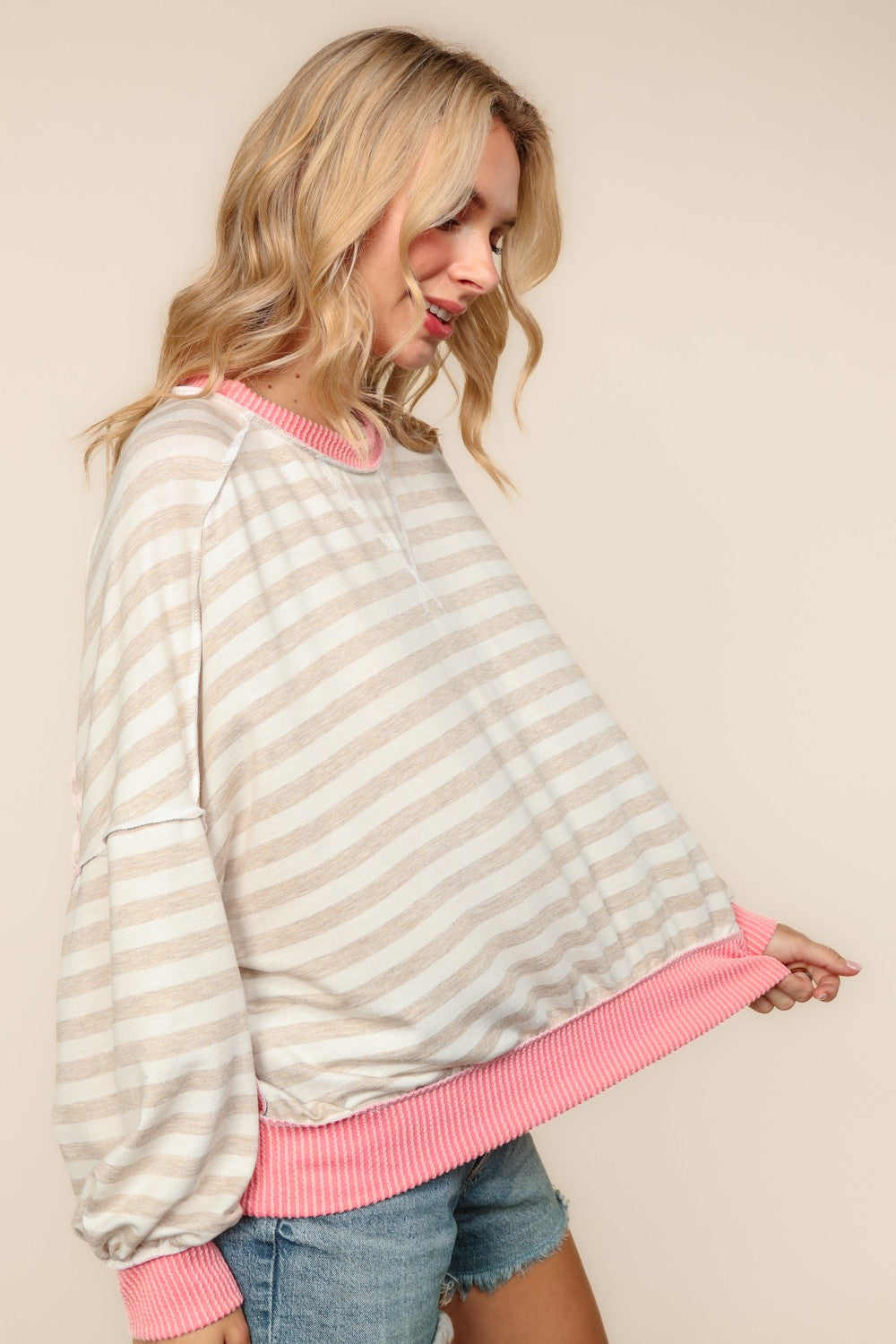 CREW NECK WITH TRIANGLE DETAIL DROP SHOULDER LOOSE FIT OVERSIZED LONG SLEEVE COLOR BLOCK STRIPE FRENCH TERRY PULLOVER KNIT TOP WITH OUT SEAM OVERLOCK AND REVERSE STITCHES