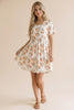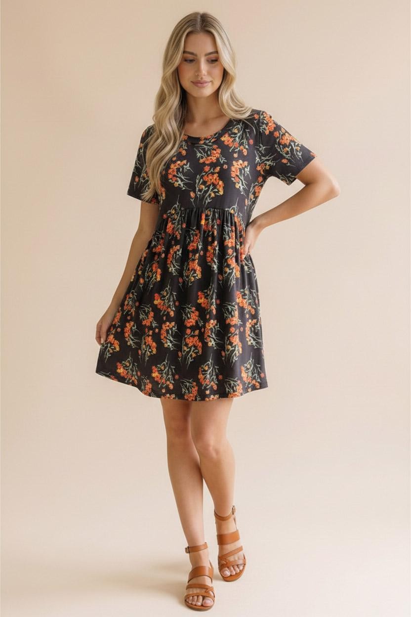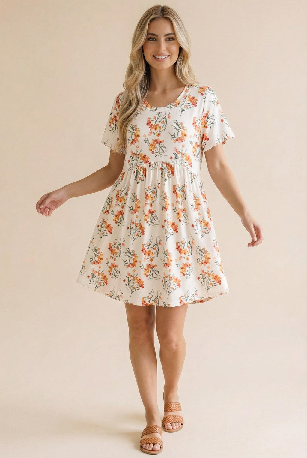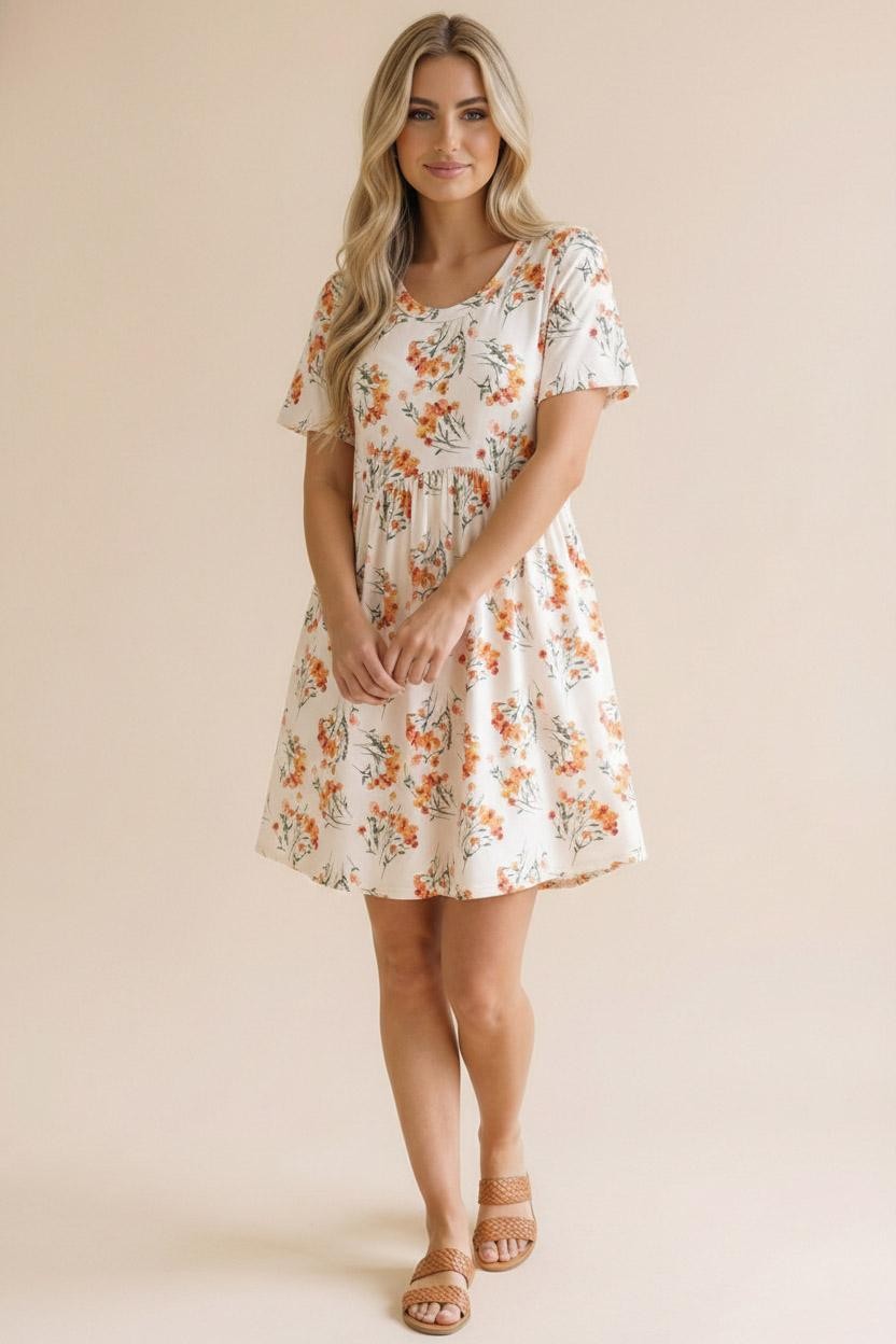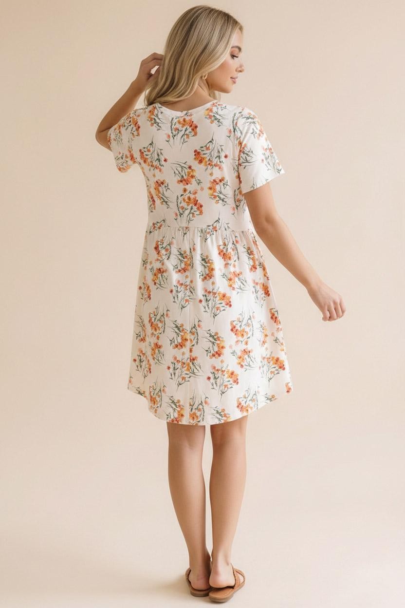 ROUND NECK SHORT SLEEVE BABYDOLL FIT AND FLARE FLORAL PRINT KNEE LENGTH KNIT DRESS WITH SIDE POCKETS