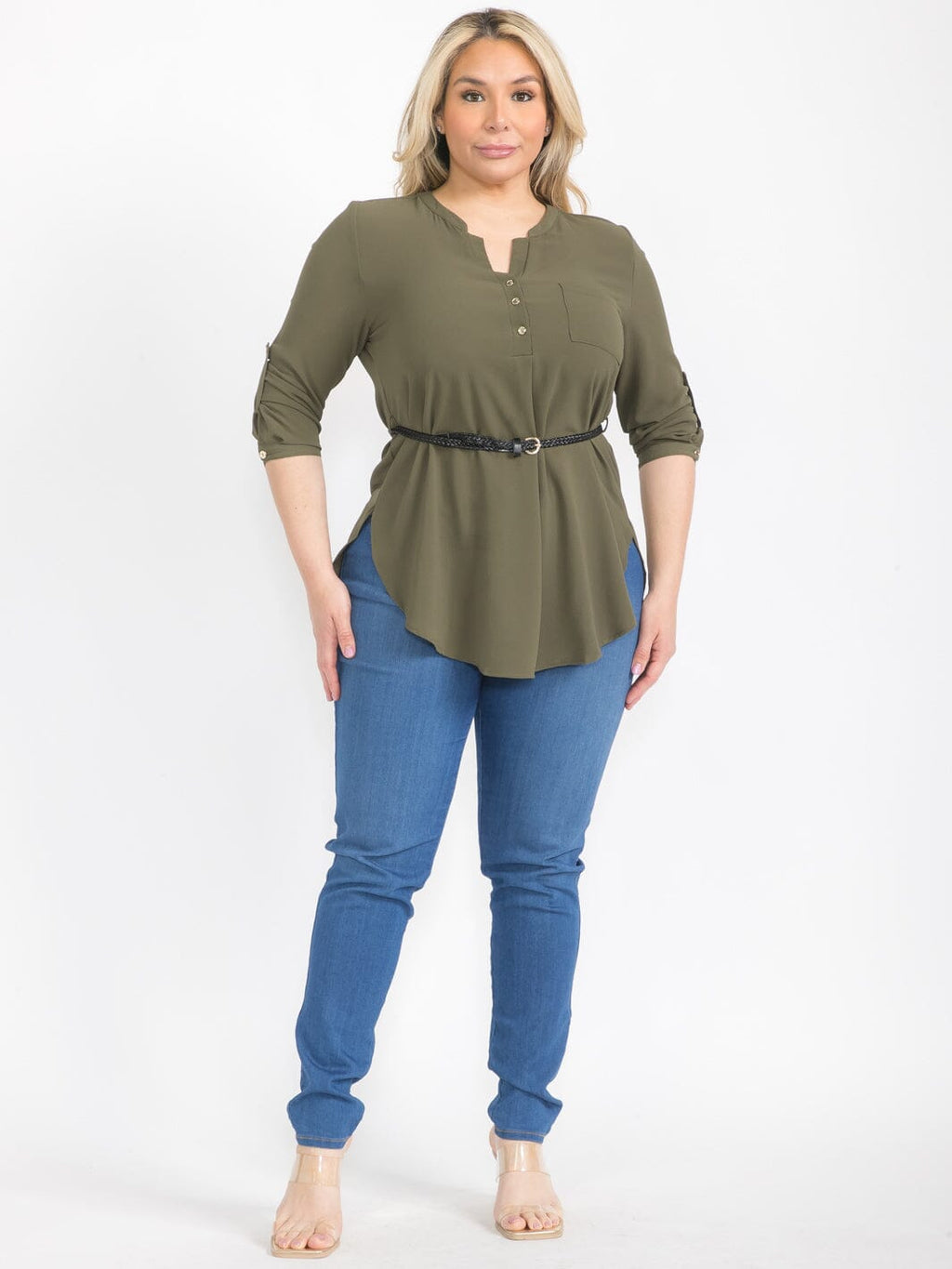Elevate your boutique's offering with this chic plus size tunic that features a sophisticated 3/4 sleeveless design and an elegant button-up front. Crafted from a breathable fabric blend, this stylish blouse is perfect for a range of occasions, from casual brunches to summer vacations. The belted silhouette flatters every figure, providing both comfort and versatility that your customers will love.