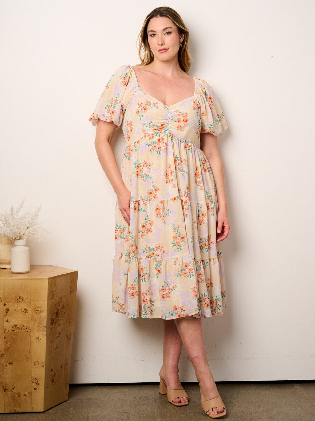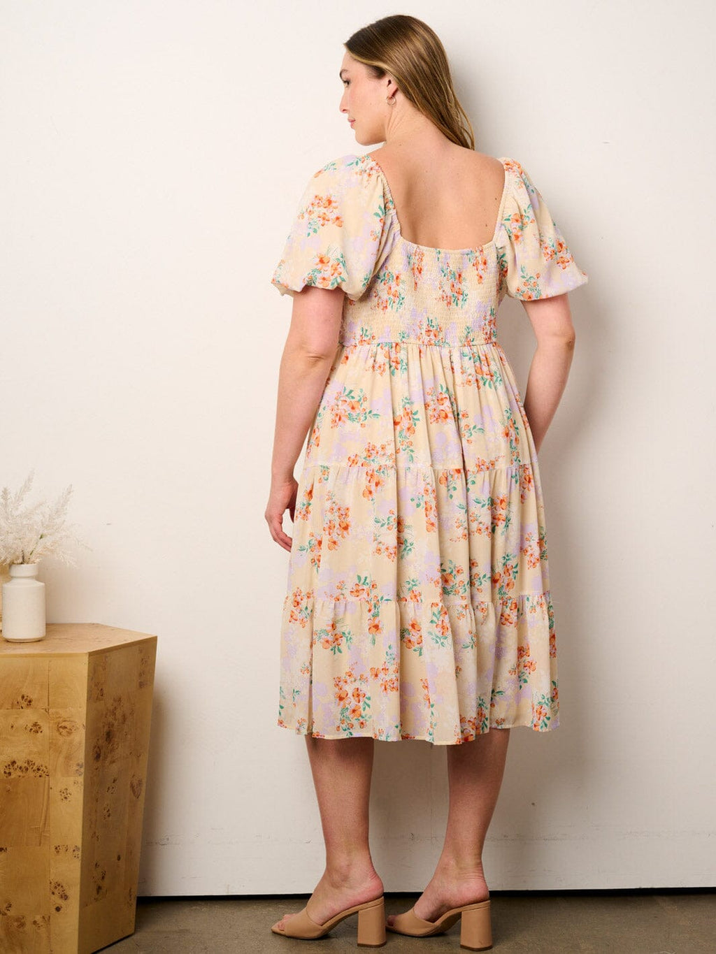 Discover the elegance of the Plus Size Tiered Floral Midi Dress, featuring short puff sleeves and an elastic waist for a flattering fit. Crafted from lightweight polyester, this dress is perfect for transitional weather and adds a touch of floral charm to any wardrobe. Ideal for boutique owners and retailers, it's a standout piece that transitions seamlessly from day to night, offering versatility for various occasions.