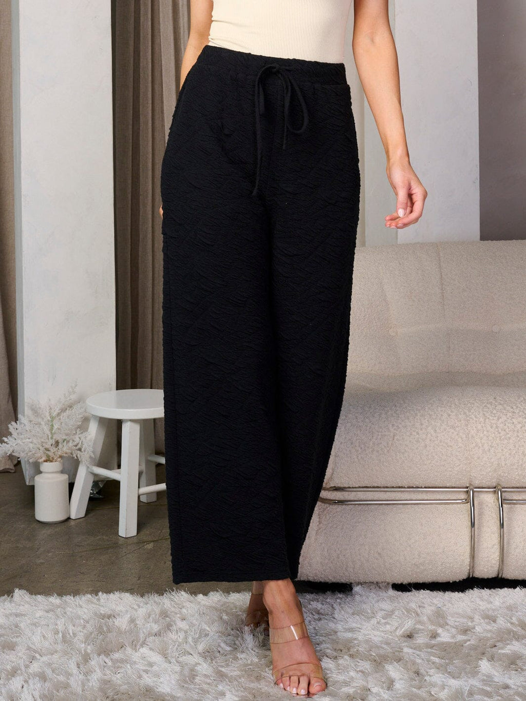 Elevate your wardrobe with our WOMEN'S ELASTIC WAIST POCKETS SELF TIE DETAILED WIDE LEG PANTS. These pants feature a comfortable and chic wide leg silhouette, with an elastic waistband and self-tie detailing for a flattering and adjustable fit. The pockets add a functional touch while the lightweight and stretchy fabric make these pants a must-have for any season. These pants are a bestseller with boutiques, offering the perfect blend of trend-forward design and everyday wearability.