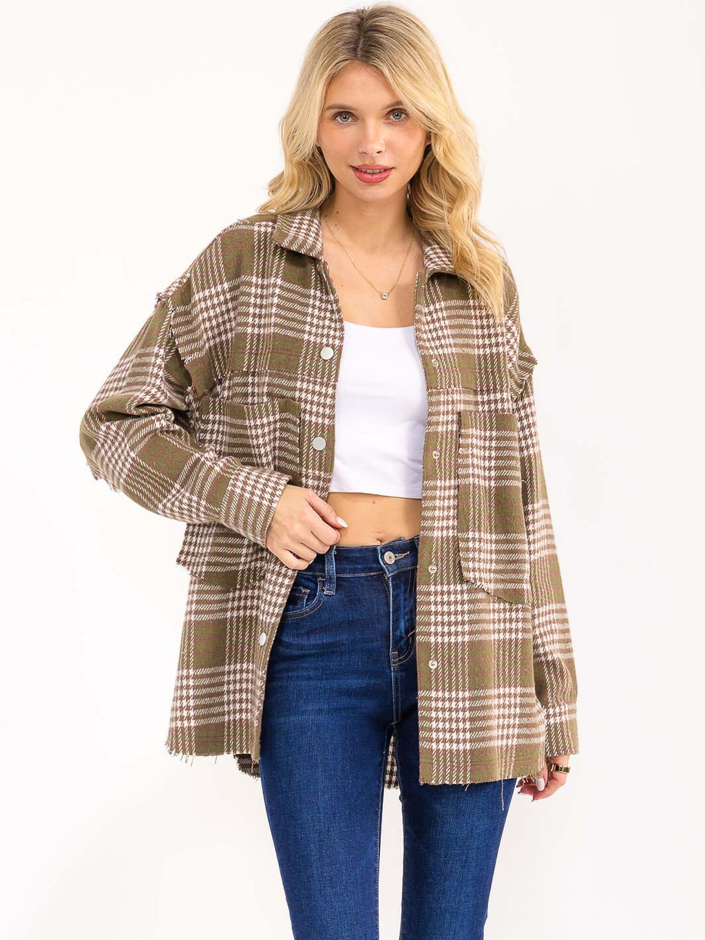 Features:Brushed 100% polyester fabrication, relaxed fit for all-day comfort, front button closure for easy styling, functional chest pockets, versatile plaid pattern, ideal for layering in transitional weather, popular with contemporary boutiques
