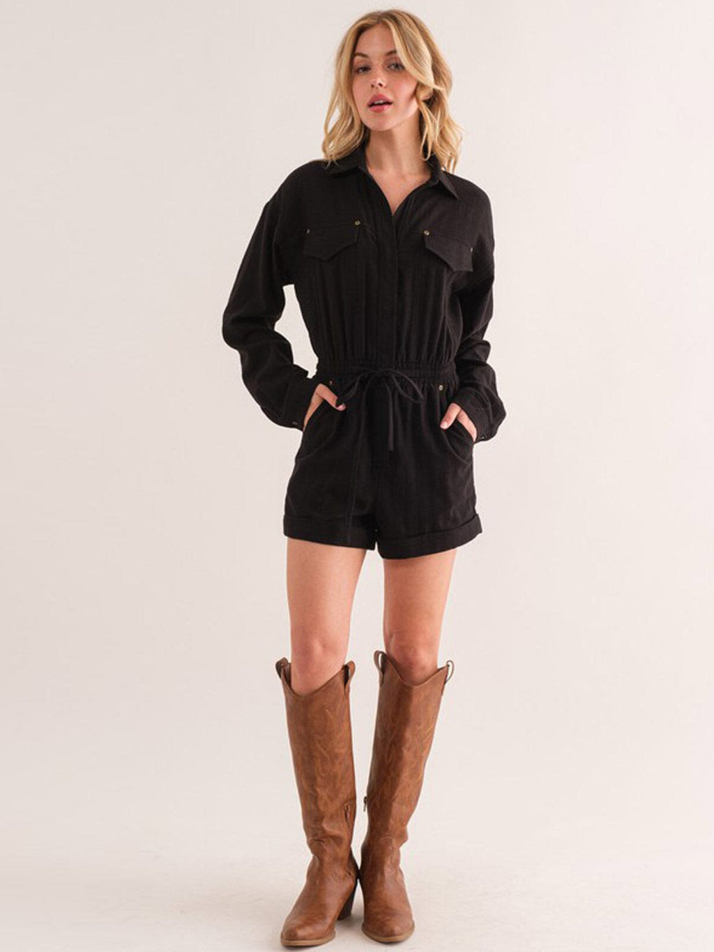 This long sleeve elastic waist romper is a sought-after piece that stands out in any retail setting. Its reasonable price point offers excellent markup potential for boutiques, while its classic style ensures steady demand and easy reorder management. The romper's combination of comfort, style, and adaptability makes it an essential addition for both in-store displays and online retail platforms.
