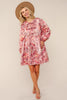 FRONT RIBBON BOW TIE ROUND NECK BABYDOLL PUFF BUBBLE LONG SLEEVE FLORAL PRINT DULL SATIN WOVEN MINI DRESS WITH SIDE POCKETS