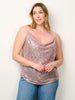 This elegant plus-size sleeveless tank top features a chic cowl neck and shimmering sequins that make it a standout piece for any collection. Crafted from a soft polyester-spandex blend, it offers a flattering silhouette perfect for evening wear or upscale casual occasions. This trend-forward garment is a bestseller with boutiques, offering versatility for layering or as a standout solo piece.