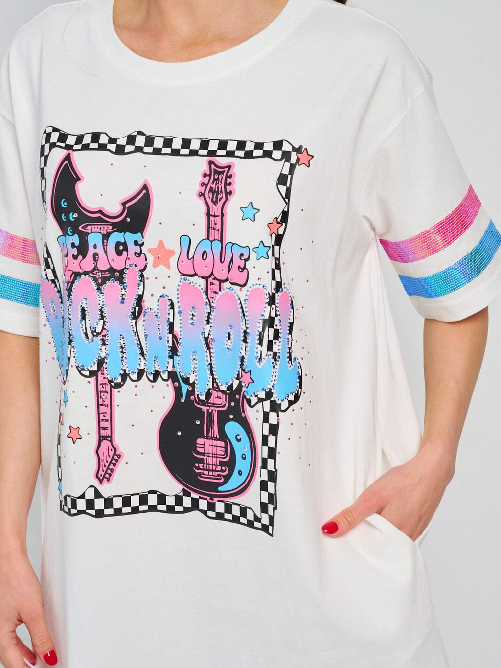 • Model is wearing size small Length: 34" Bust: 34" Waist: 17".