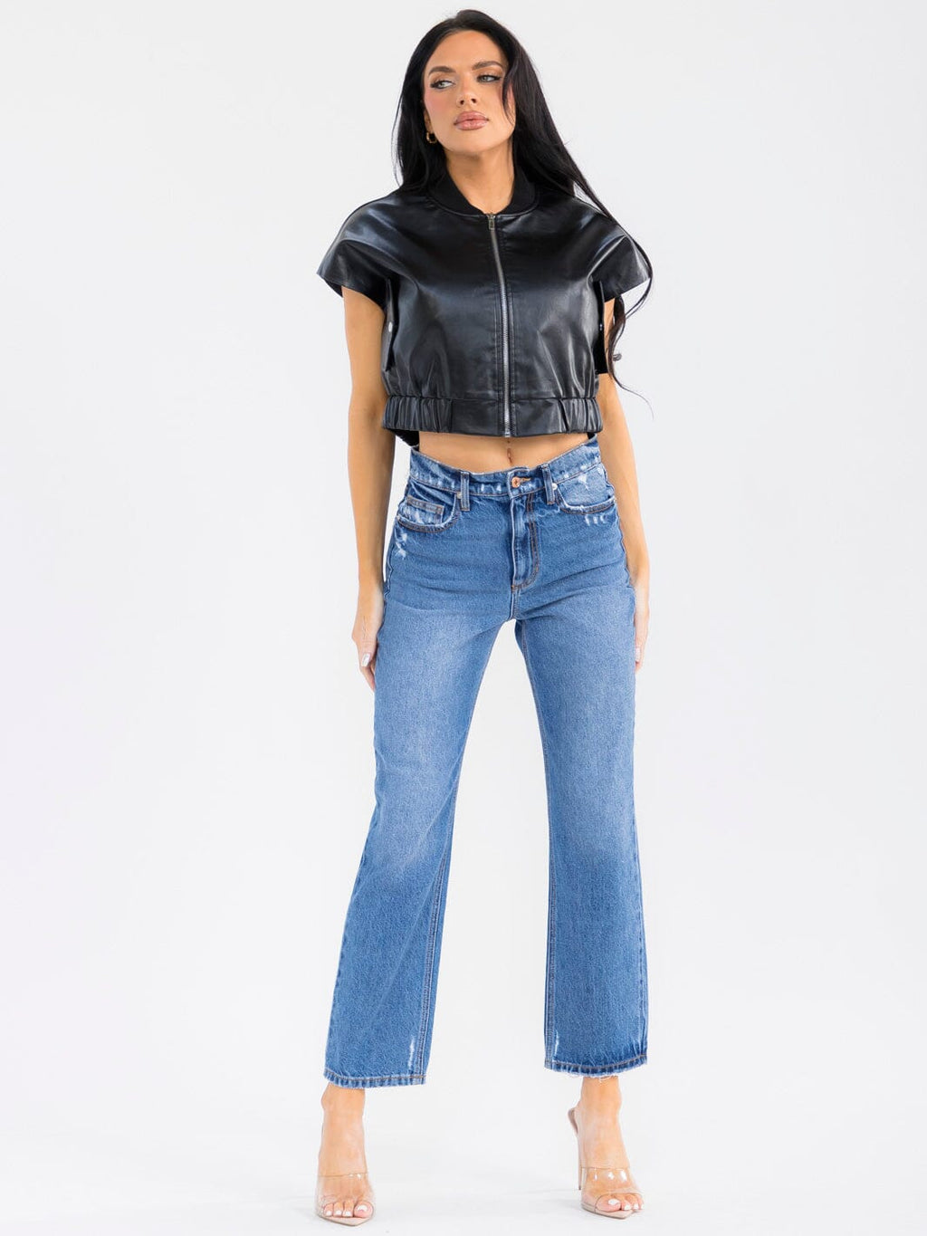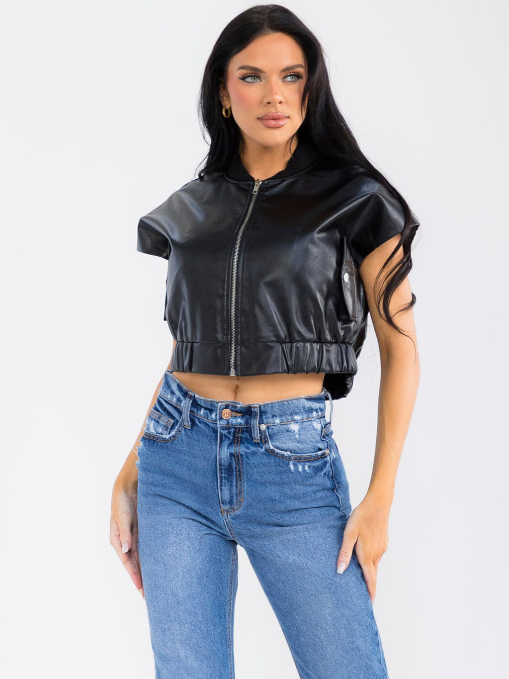 Premium PU and cotton blend, cropped modern silhouette, smooth polyester lining for comfort, functional front zip and pockets, ideal for layering or standalone wear, versatile for festival or street-style displays, easy pack merchandising for boutiques.