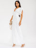 Features:Soft poly-spandex lining, dramatic wide-leg cut, surplice V-neckline with ruffle detail, available in vibrant red and ivory colorways, versatile for day-to-night wear, seasonless appeal, easy hand-wash care