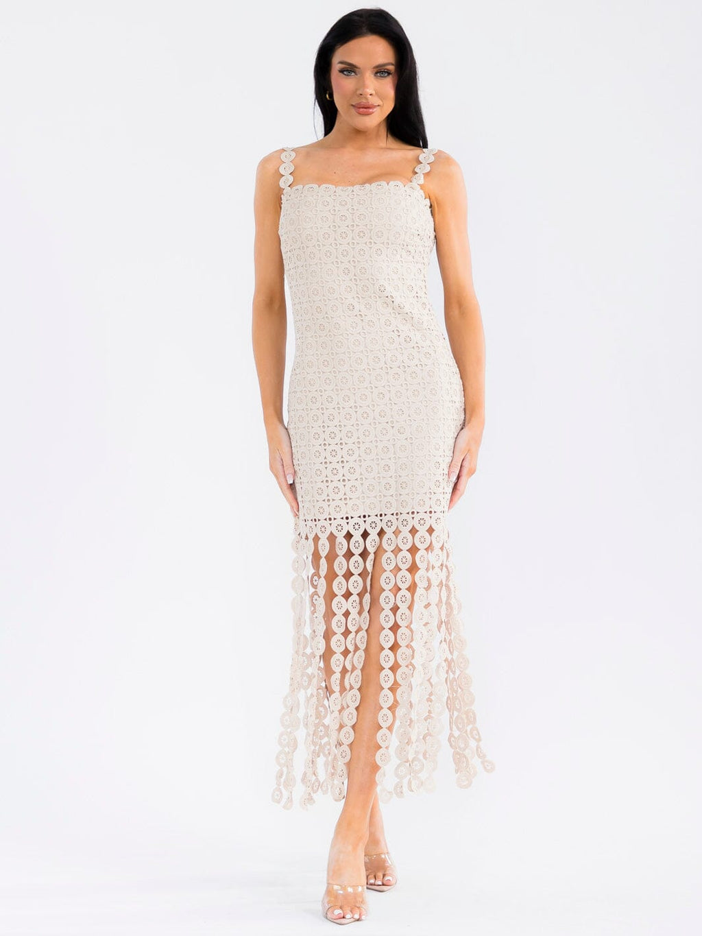 Polyester fabric for comfort, bodycon silhouette for a flattering fit, fringe hem detailing, perfect for cocktail events, easy hand wash care, versatile styling options, boutique favorite for contemporary fashion.