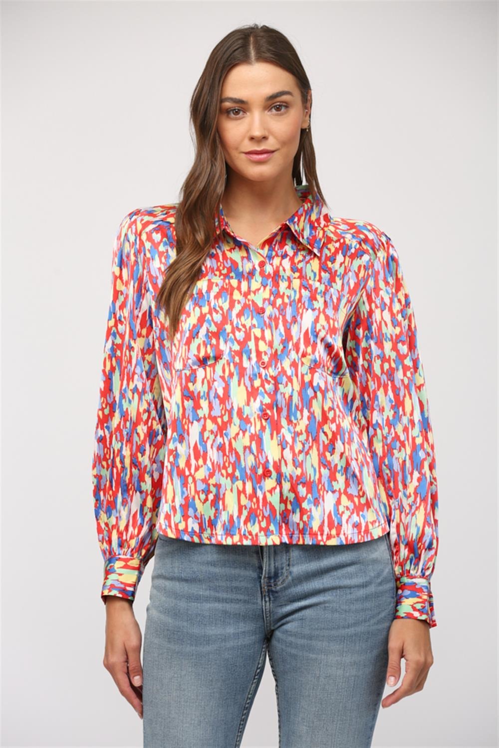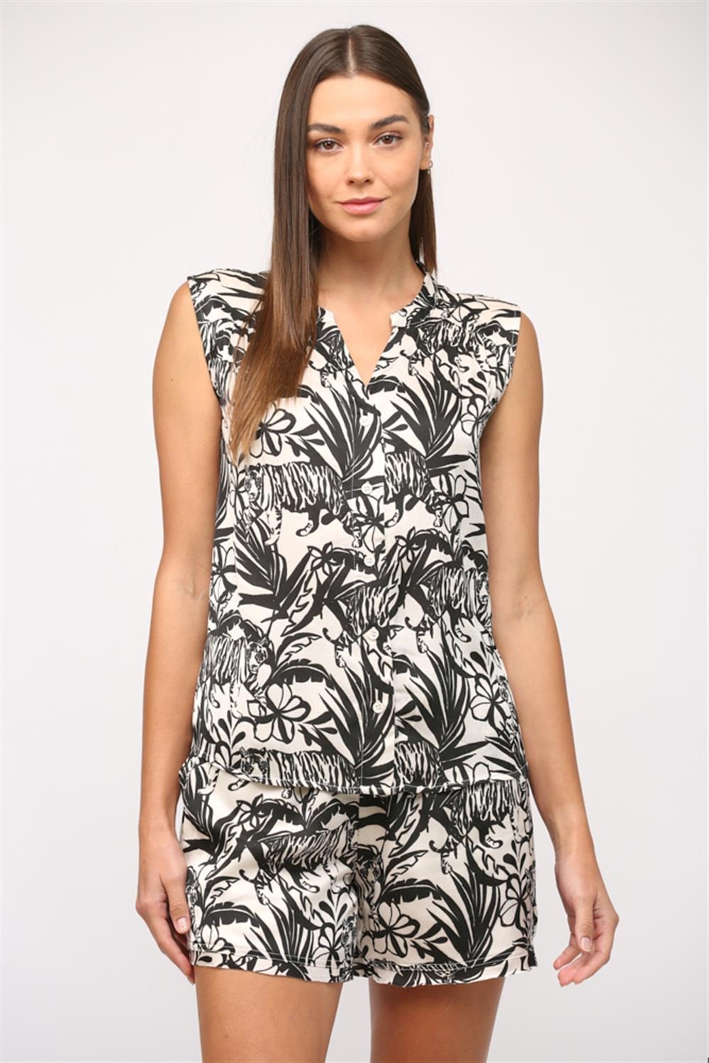 abstract animal print sleeveless split neck shirt and satin short 2pcs