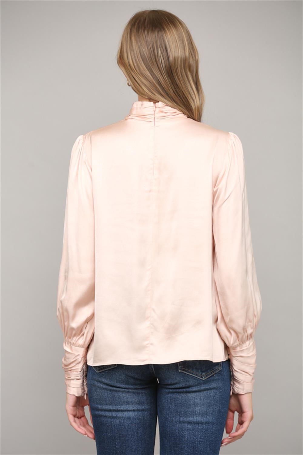 high collar long ruched sleeve with zipper detail blouse